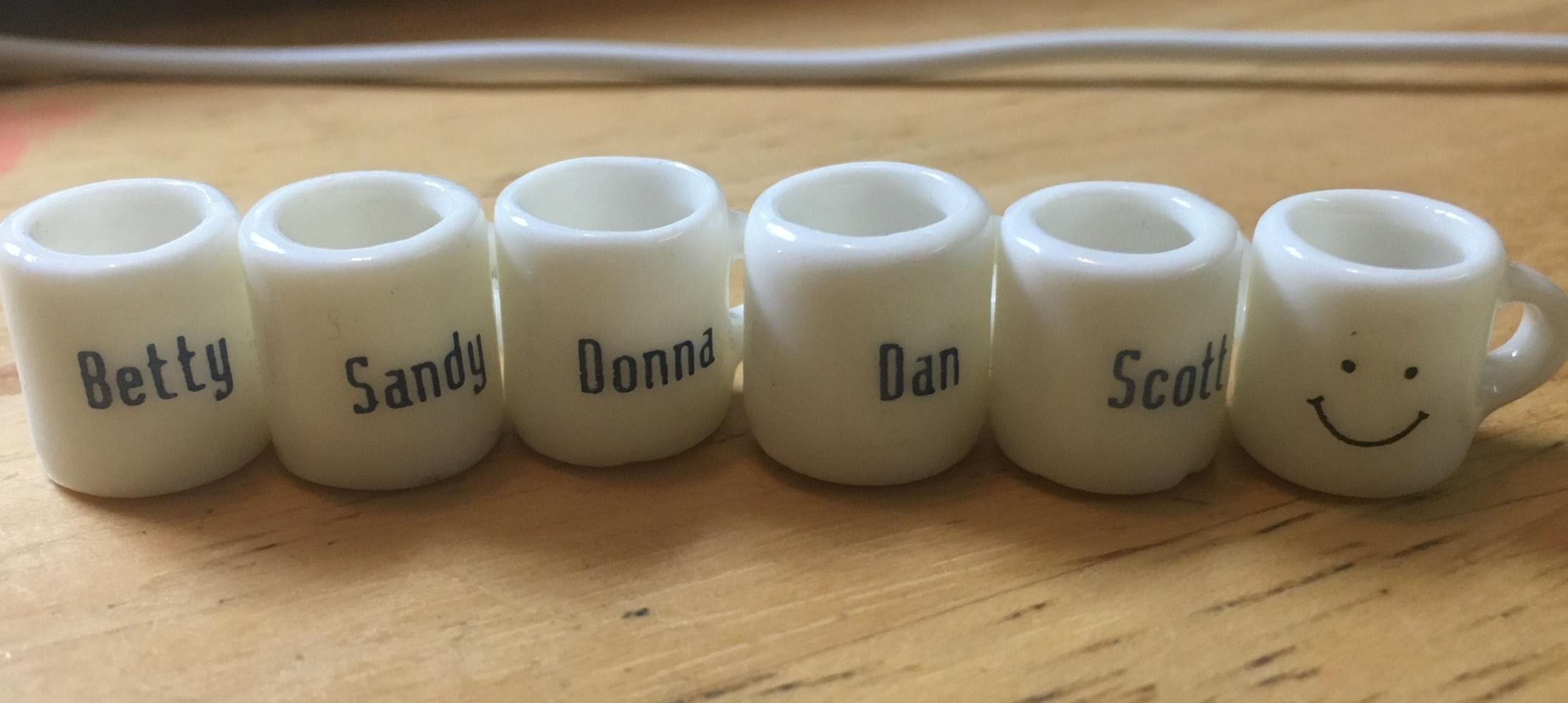 I put this image up as my header after my mom died a little over two years ago. Found in her things where these tiny cups with all of our names. There is even a sweet little stand for them. They became a little shrine to a family who had lost its center.