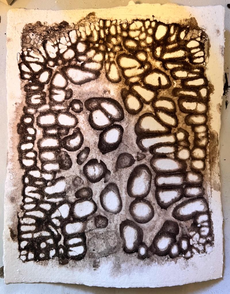 think I applied the structure paste too thickly. When I added the wet pigment the crackly texture crackled right off. I love what is left behind though.
