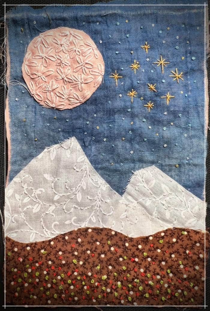 Day 45. Moon flowers and stars over snow mountains and meadow flowers