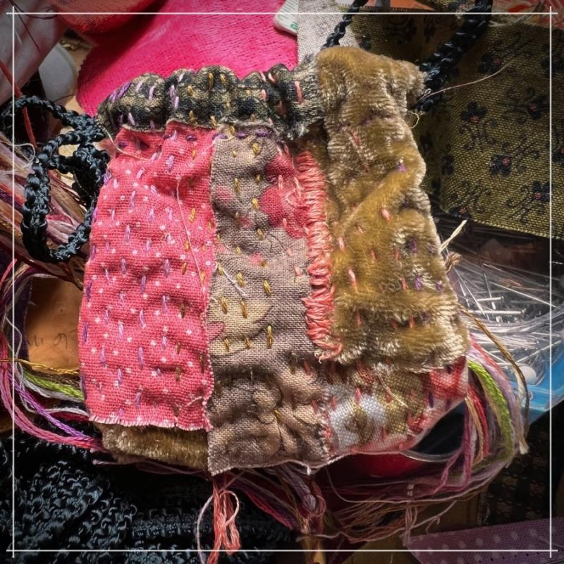 I still gather color in this way when I find a sale or thrift story bounty, adding it to one of those clear bags with snaps that a pillow case came in long ago. When the mood strikes or the art calls for it I pull out my bag of color and know I have have what I need to stitch away. My tiny stitched bags are the latest recipient of this bounty.