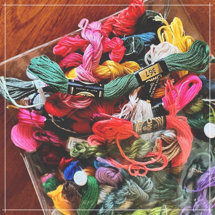 was in junior high I think, I started gathering embroidery floss. Small hanks of DMC are still inexpensive but back then it was really cheap, like 10 for a dollar cheap. I could grab a handful and barely make a dent in my babysitting money. I felt indulgent and abundant picking out bunches of colors and tucking them away knowing someday they would be perfect for what I needed. It has proven true. This decently stuffed bag has been a craft companion for decades.