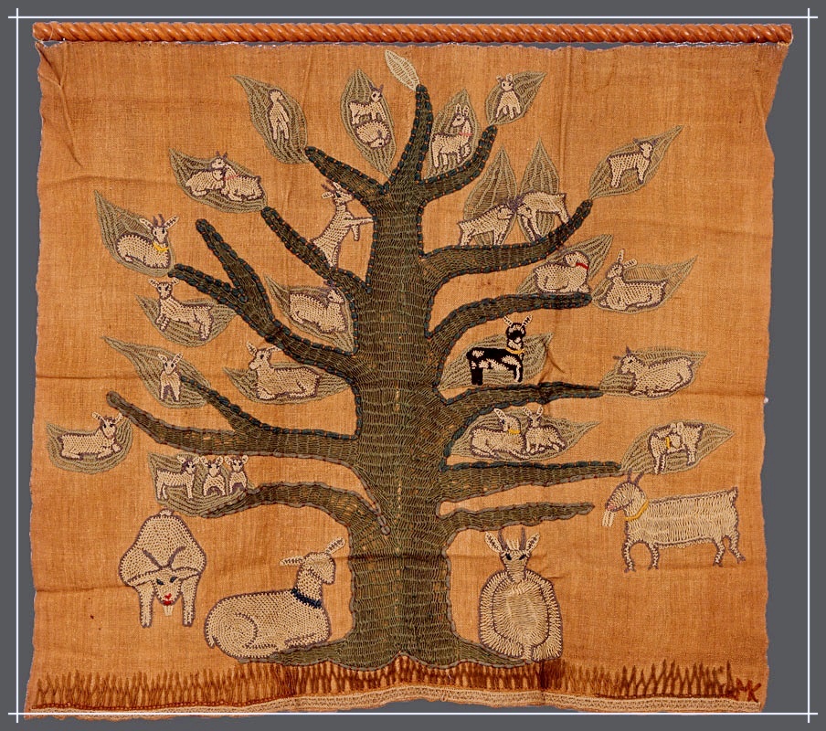Goat Tree, ca 1947 Mixed fibers on unidentified four-salvage vegetal fiber with wooden dowel, approx 43 x 47 1/2 inches