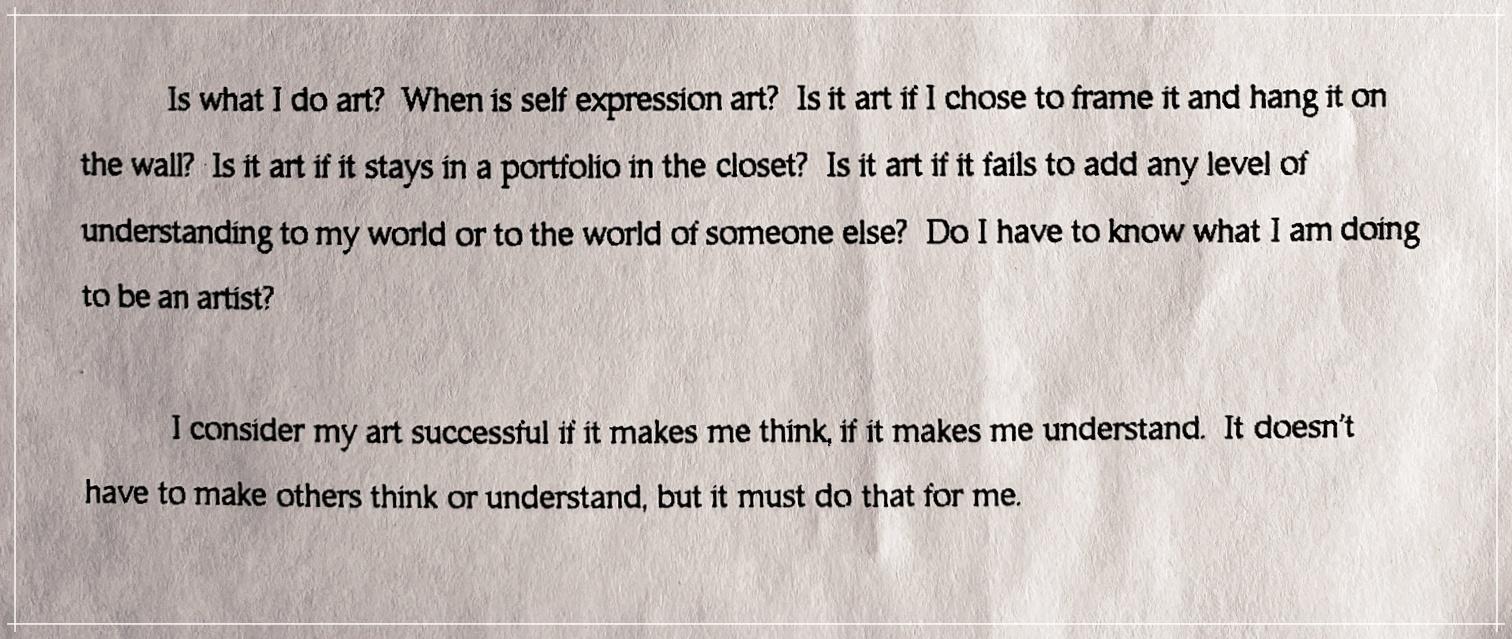 Words from 33 year old me I did have. Part of an art manifesto assignment circa 1993. Including double spaces after sentences, which was a thing we did on typewriters way back when.