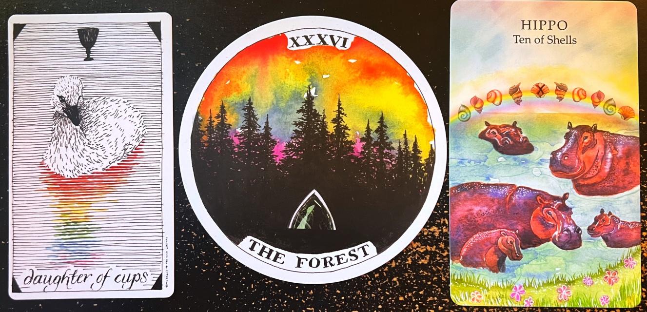 Hippo, Ten of Shells from the Animal Wisdom Tarot points me to find support in community, friends, and family. Also, to welcome the deep truths, talents, and forgotten aspects of myself. By doing so all is well, even if it doesn’t seem so. It offers the message that where acceptance lives home if found.