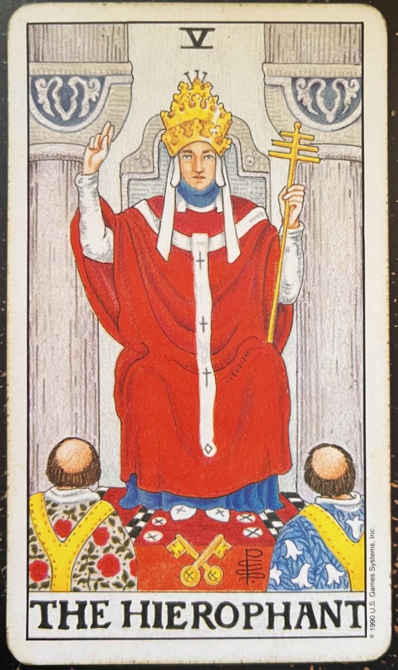 The Heirophant represents spiritual wisdom, especially within religious structure, dogma, institutions, tradition, hierarchy, teaching, conformity. The Hierophant invites us to question of how our institutions of learning, religion, and tradition are serving or not. Questions of dogma vs faith, accepting or questioning